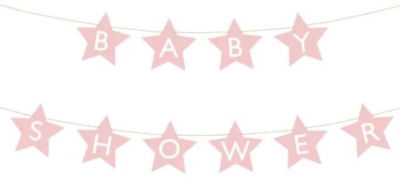 Baner w kształcie gwiazdek z napisem Baby Shower wykonany z papieru w kolorze jasnoróżowym, wymiary sznurka ok. 3m.