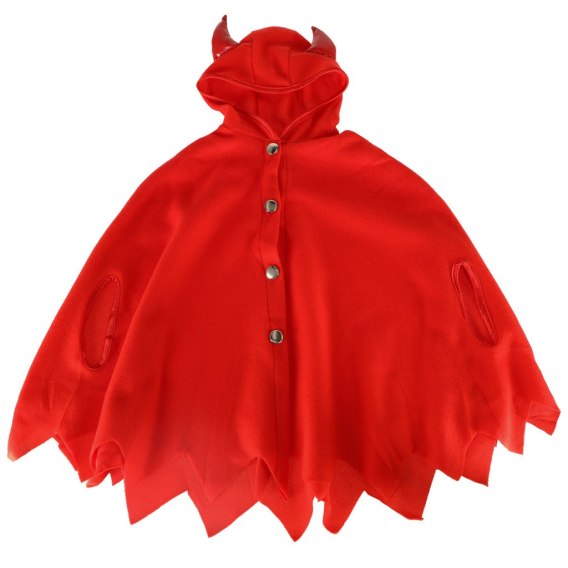 Czerwona peleryna jest wykonany z przyjemnego w dotyku materiału i jak tak uszyty, aby zapewnić swobodę ruchów, umożliwiając dziecku zabawę. Zapinana jest na cztery zatrzaski i ma kaptur z rogami. Rękawiczki mają puszek na brzegu, co stanowi interesujący akcent.